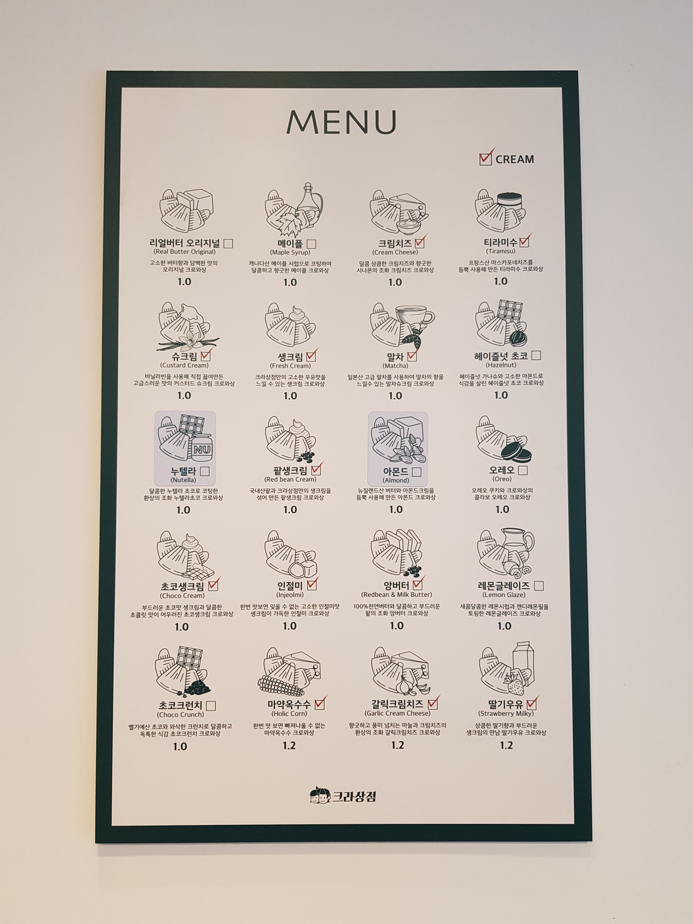 메뉴판입니다. 크라상점엔 크로와상 종류가 많아요.