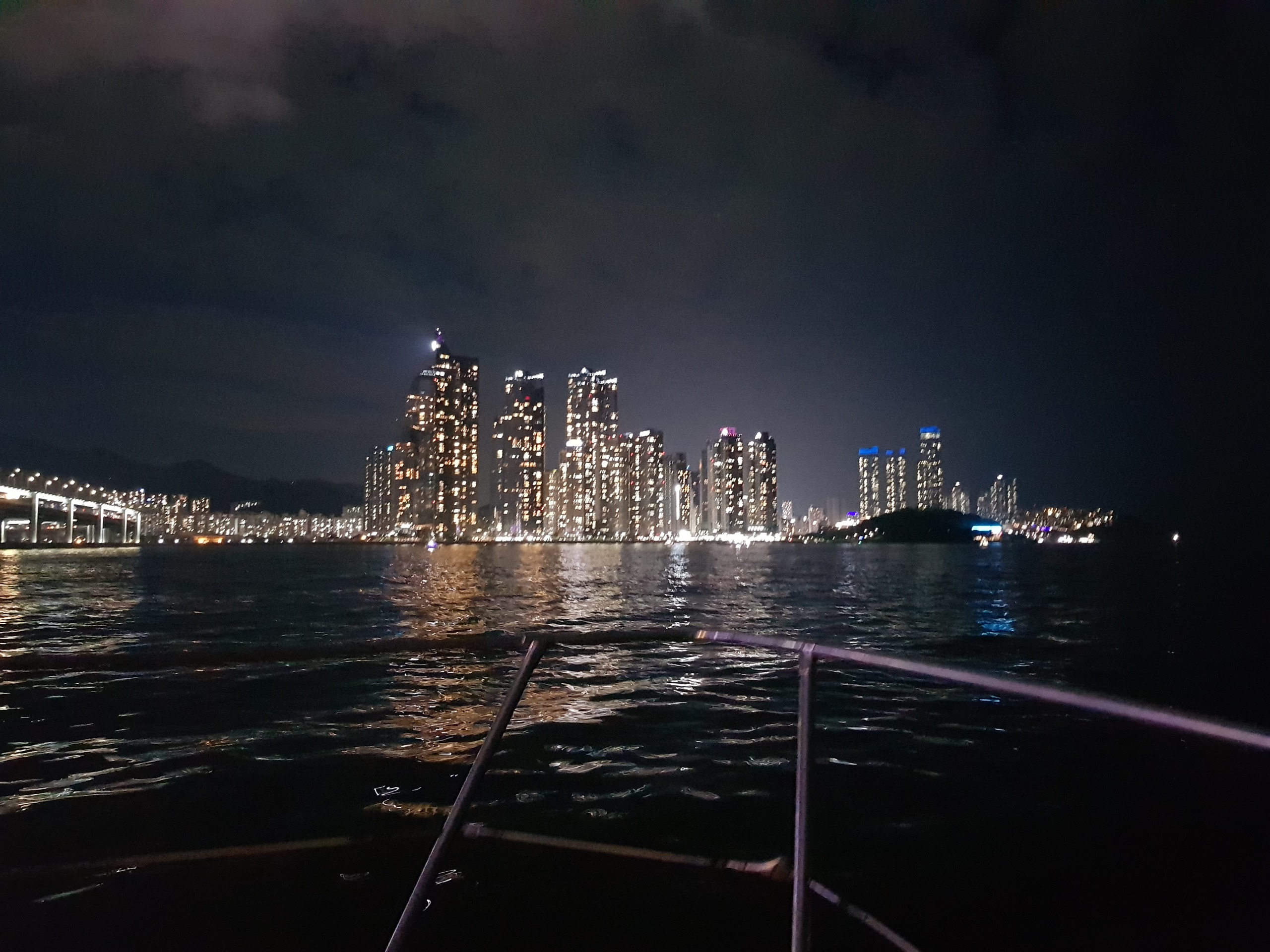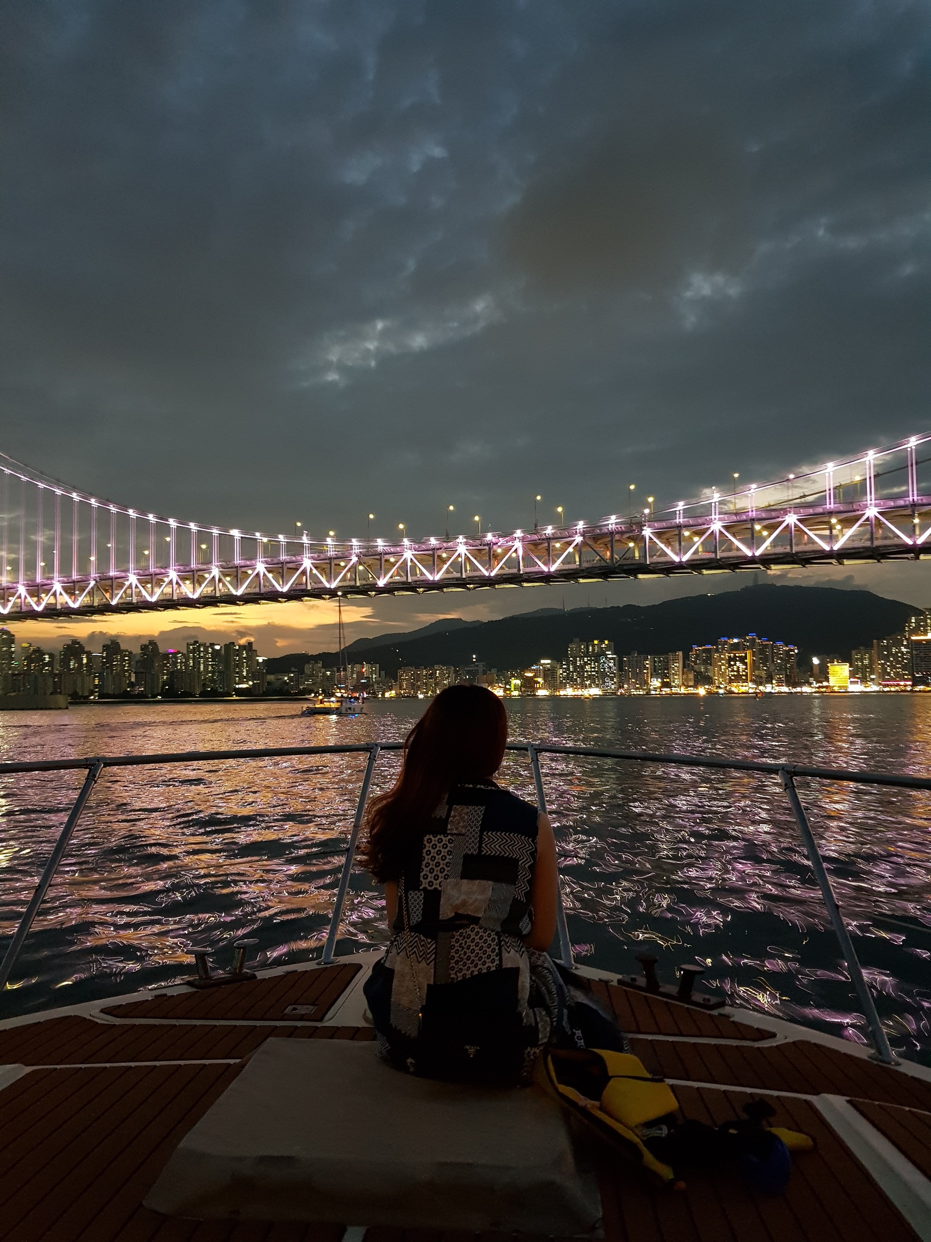 대교 근처에서 배를 세운 후 불꽃 사진 타임과 불꽃 타임도 가졌었어요.