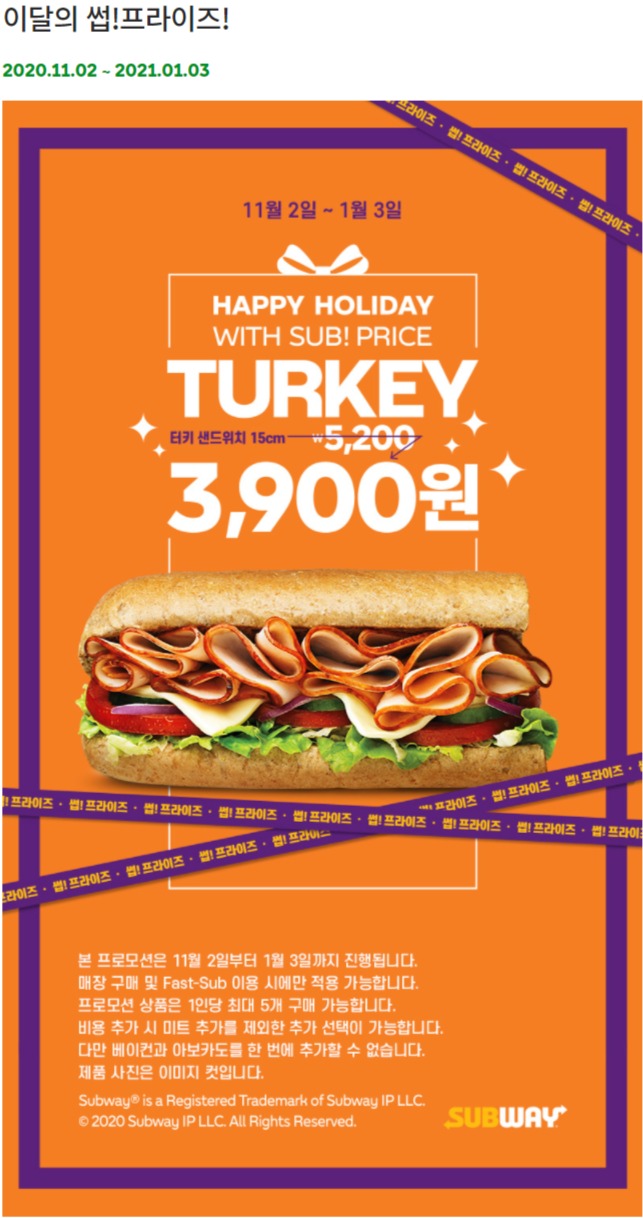 터키 샌드위치 15cm를 3,900원. 20%넘는 할인 가격으로 행사를 하더라구요.