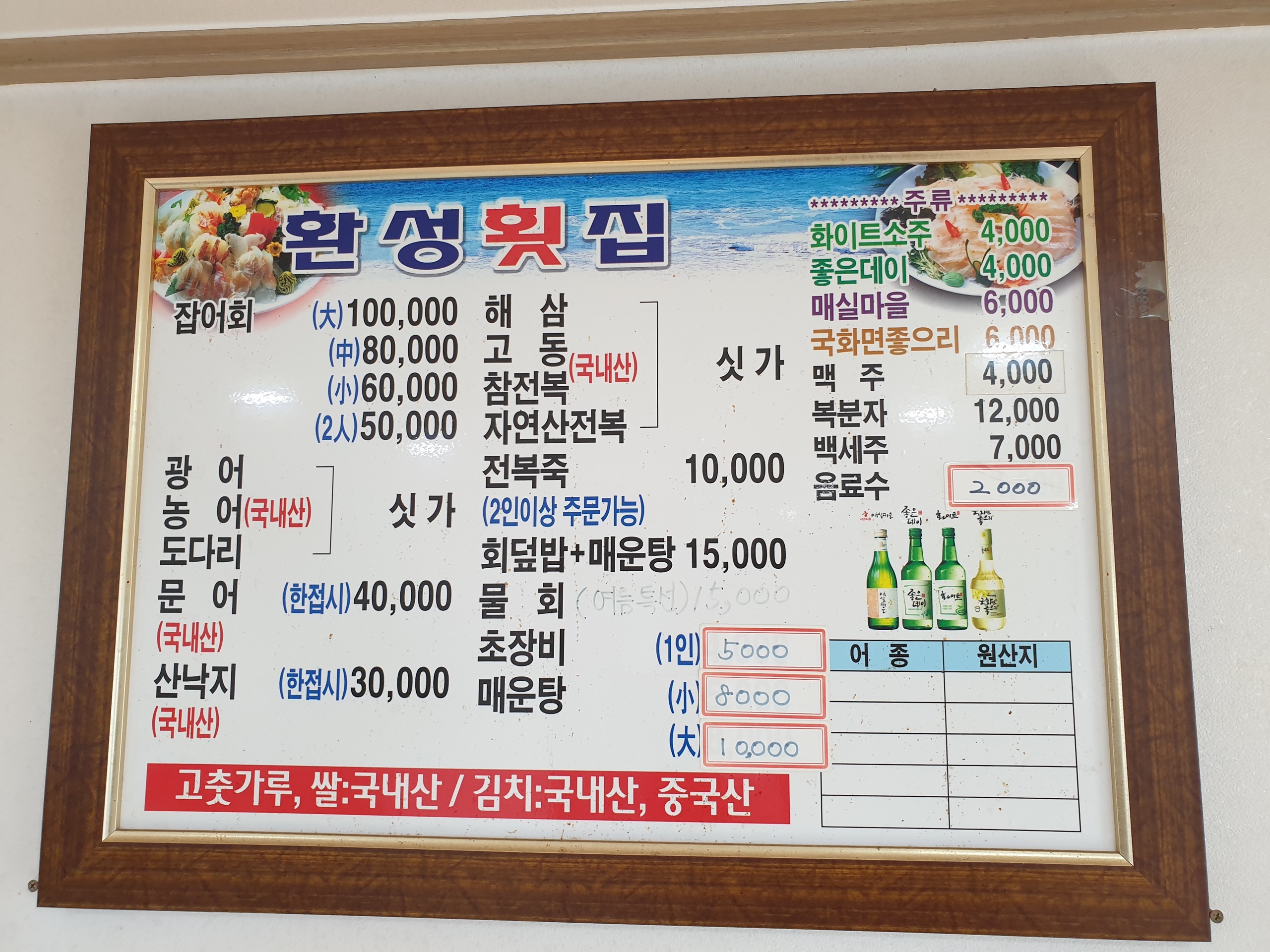 메뉴판 이구요. 여긴 보통 잡어회 대중소 중에 많이 주문들 하시더라구요.