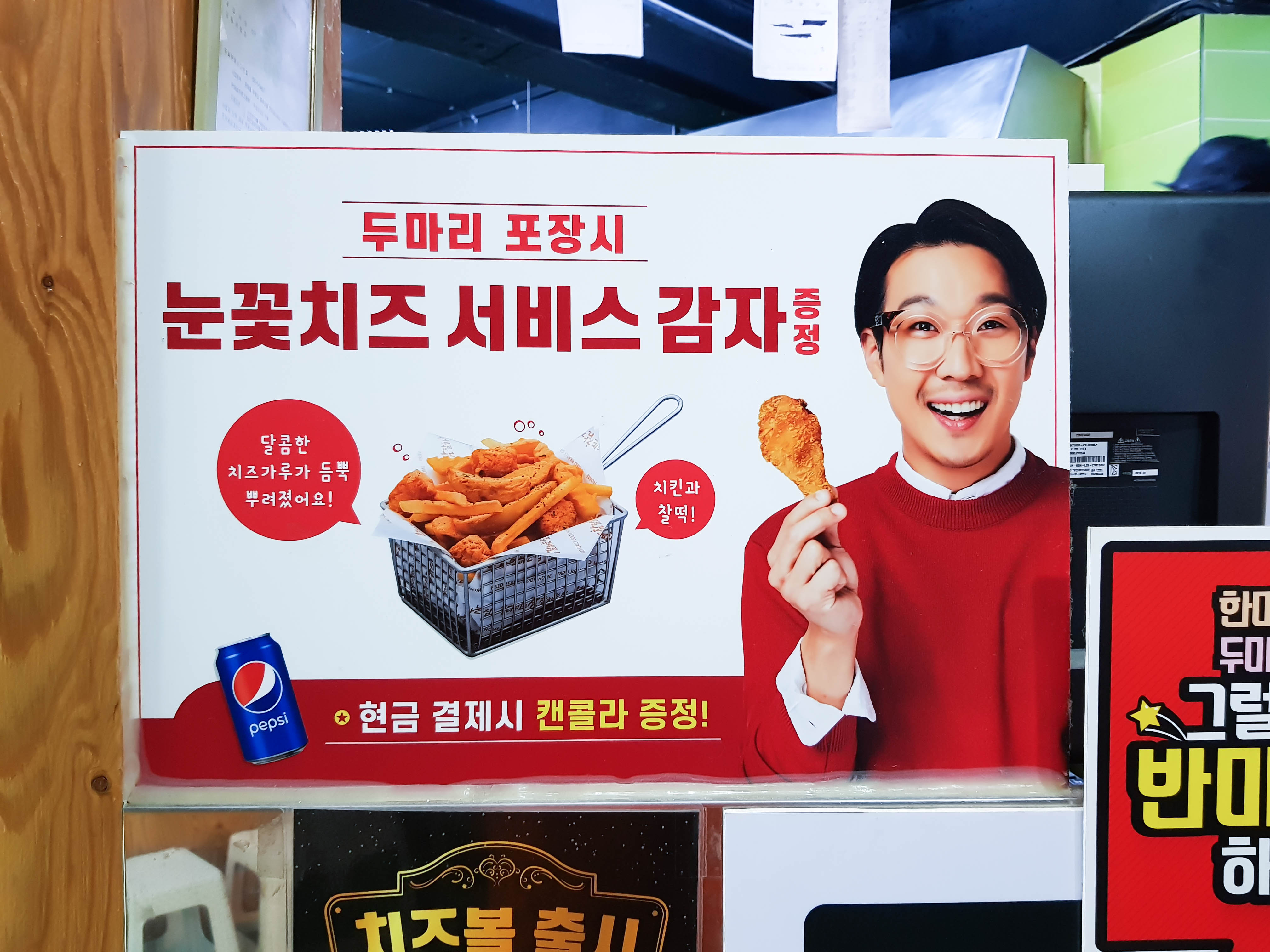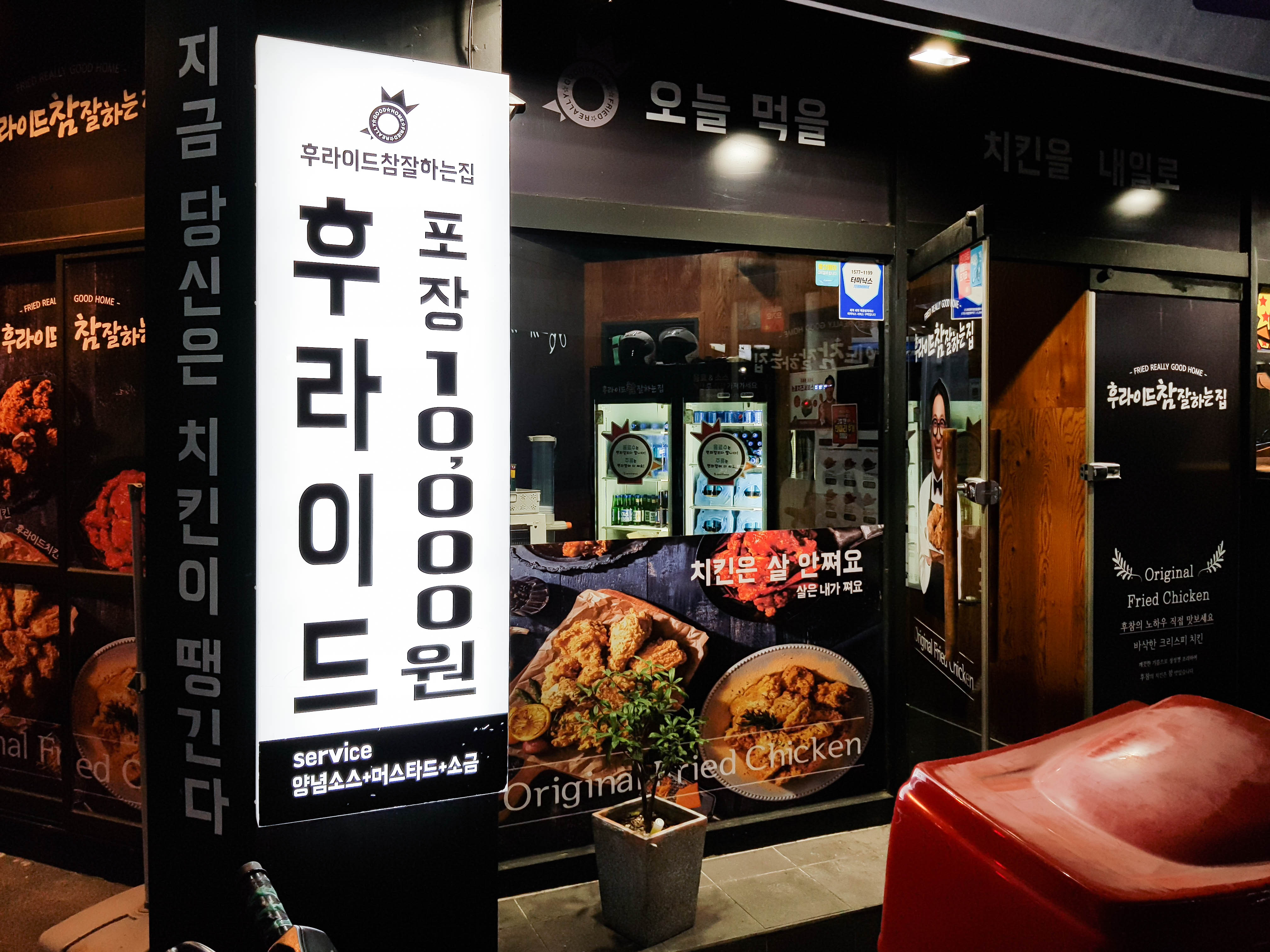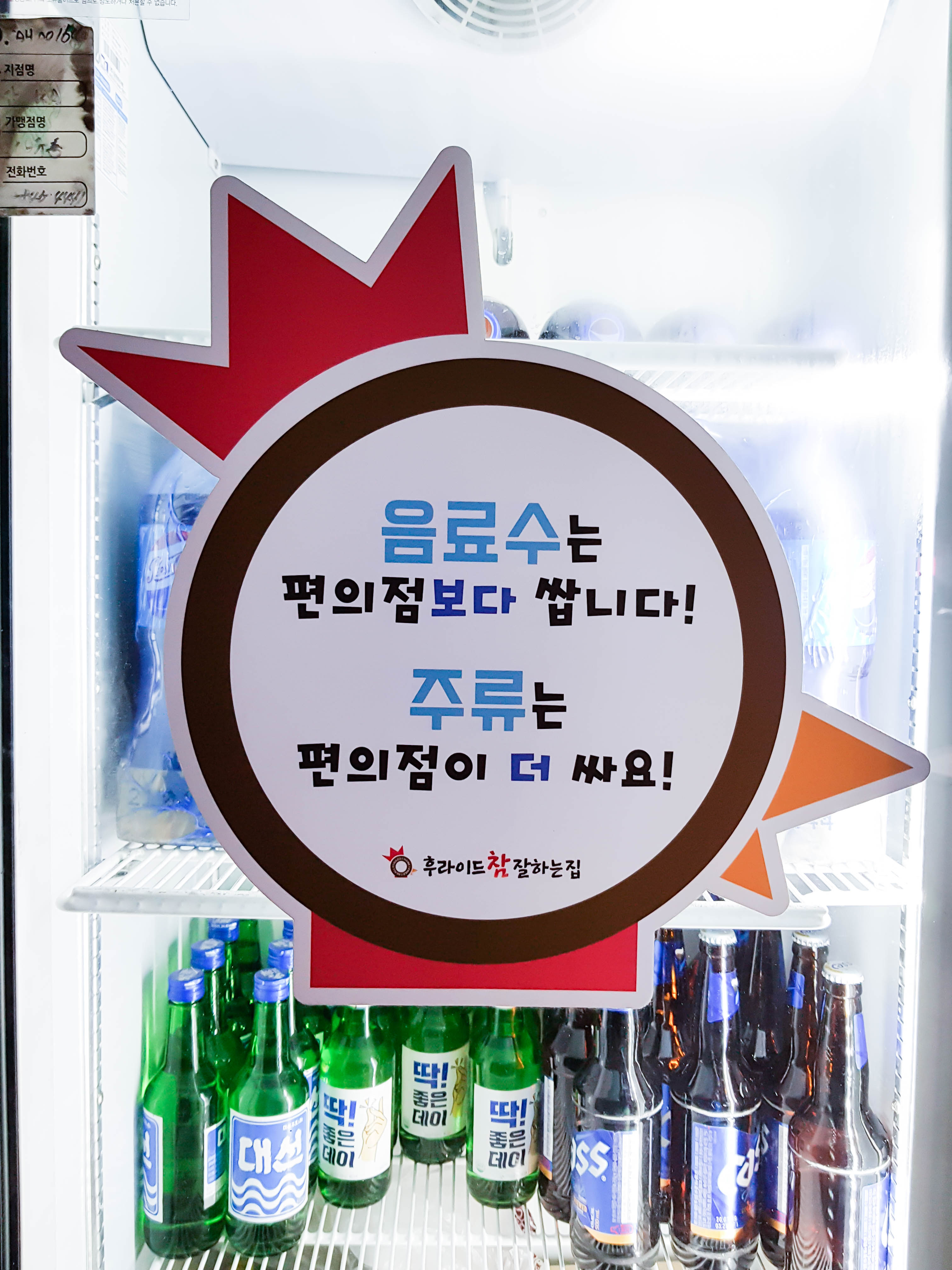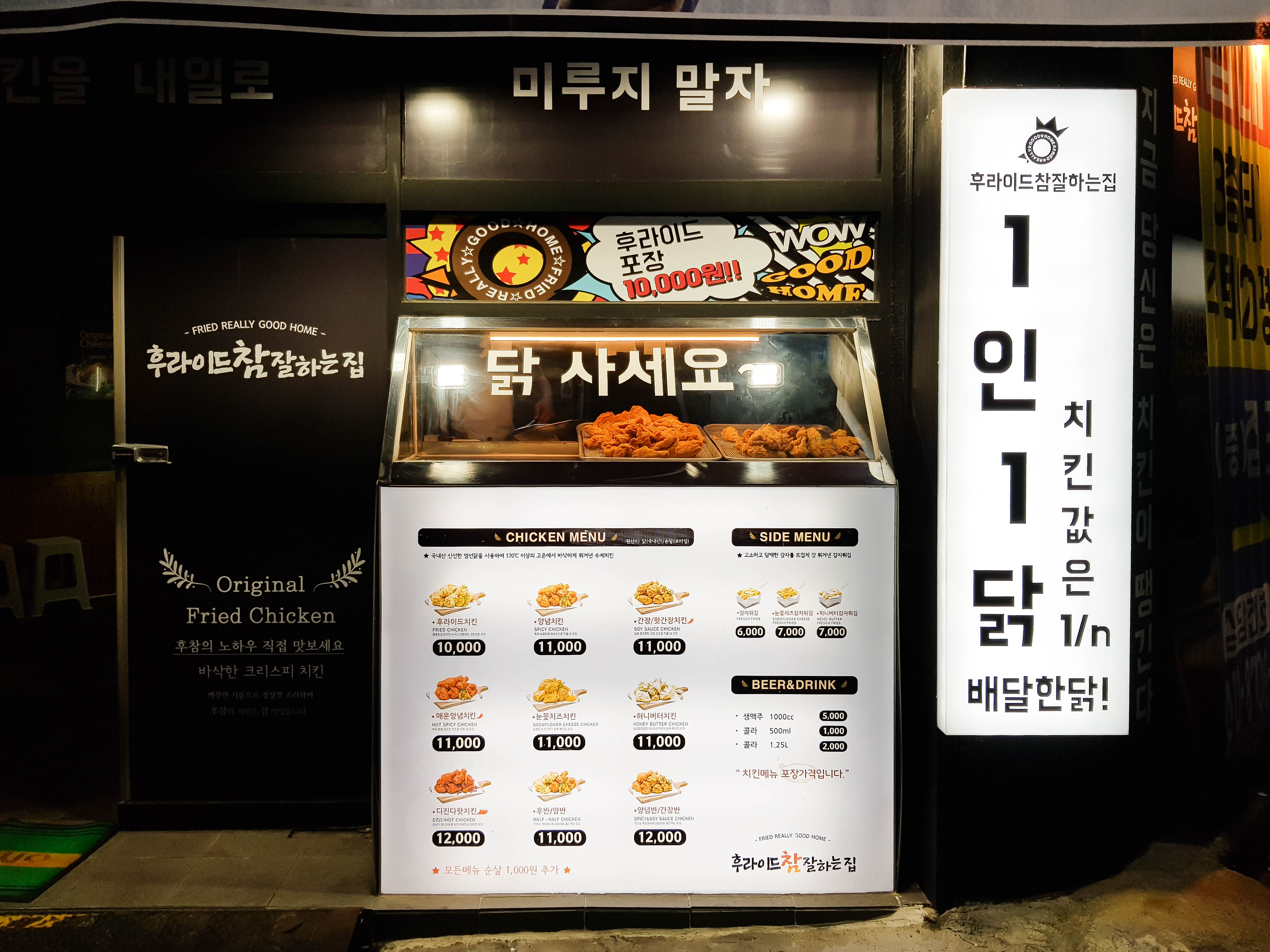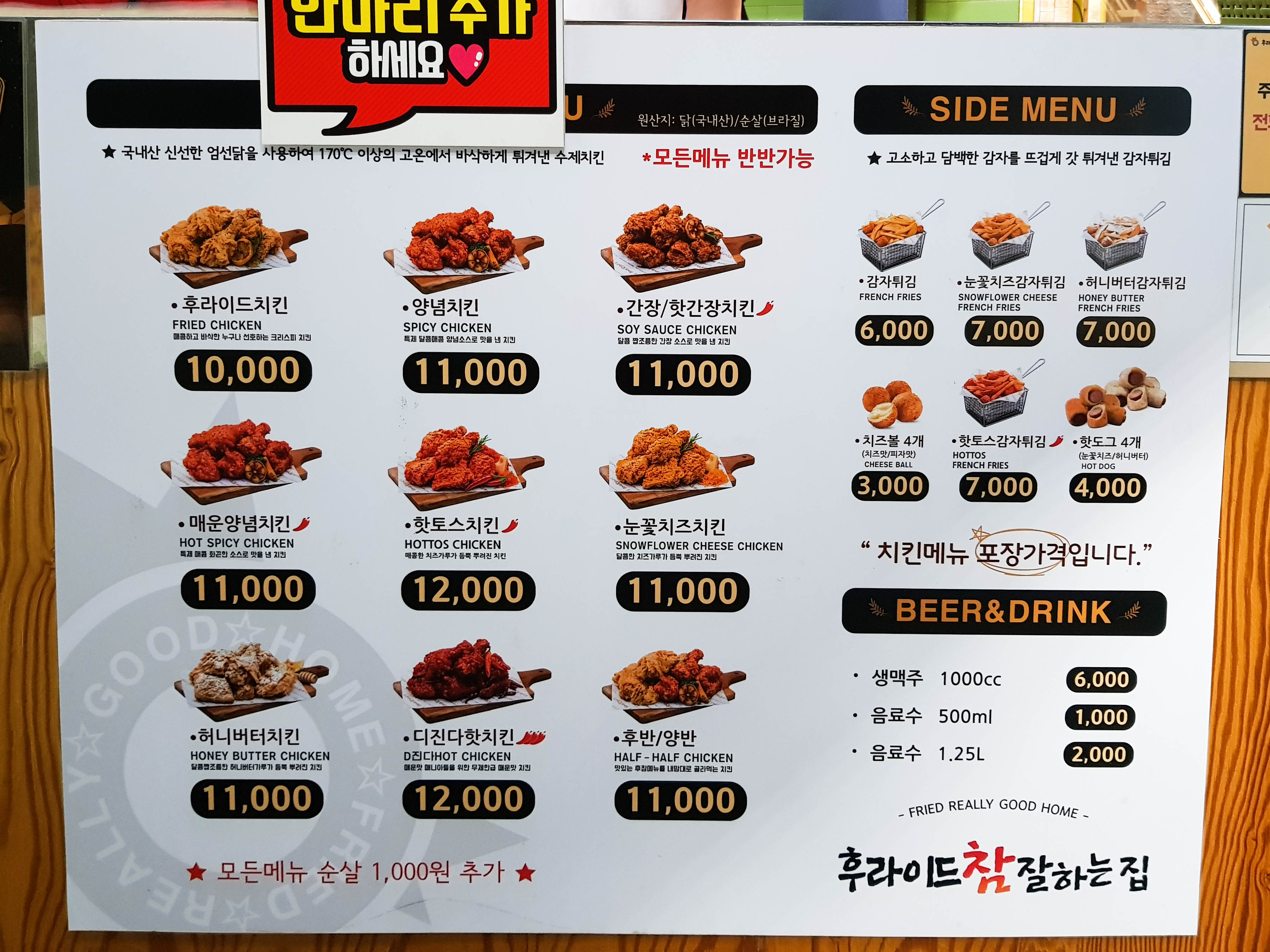 좌측에 보니 하하가 있더군요. 하하가 후라이드 참 잘하는집 광고 모델인 거 처음 알았어요. 저렴한 가격을 어필하는 옆면 입간판도 눈에 띄더라구요. 포장 후라이드는 10,000원 배달 후라이드는 1,4000원 이더라고요. 사장님께 물어보니 배달비 3,000원에 배달은 콜라를 추가로 주신다고 하더군요. 보통 치킨 주문하면 고객이 부담하는 배달비가 1,000원에서 2,000원 정도이니 배달비가 좀 비싸다는 느낌은 있었어요. 제가 주문한 메뉴도 가격이 어떻게 측정되는지는 이해가 잘 가지 않지만 방문 포장 시 19,000원 배달시 24,000원이라고 하시더라구요.