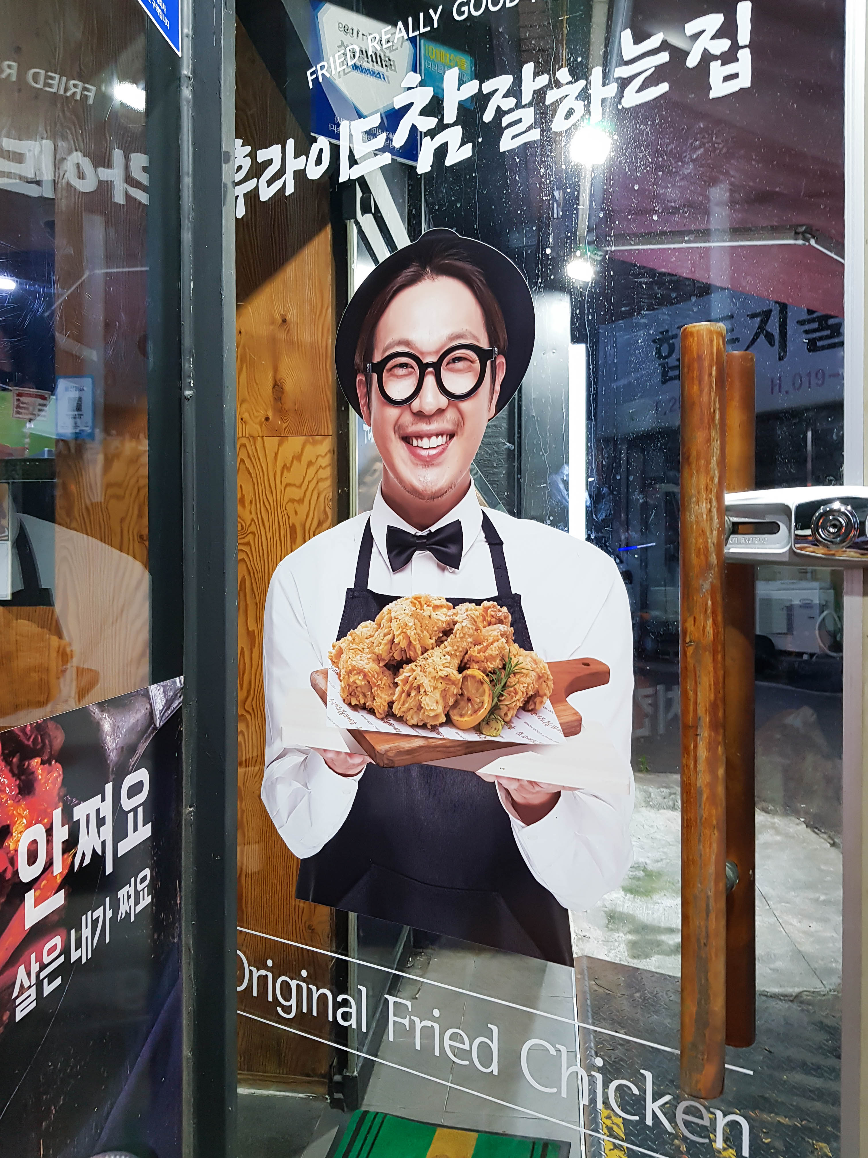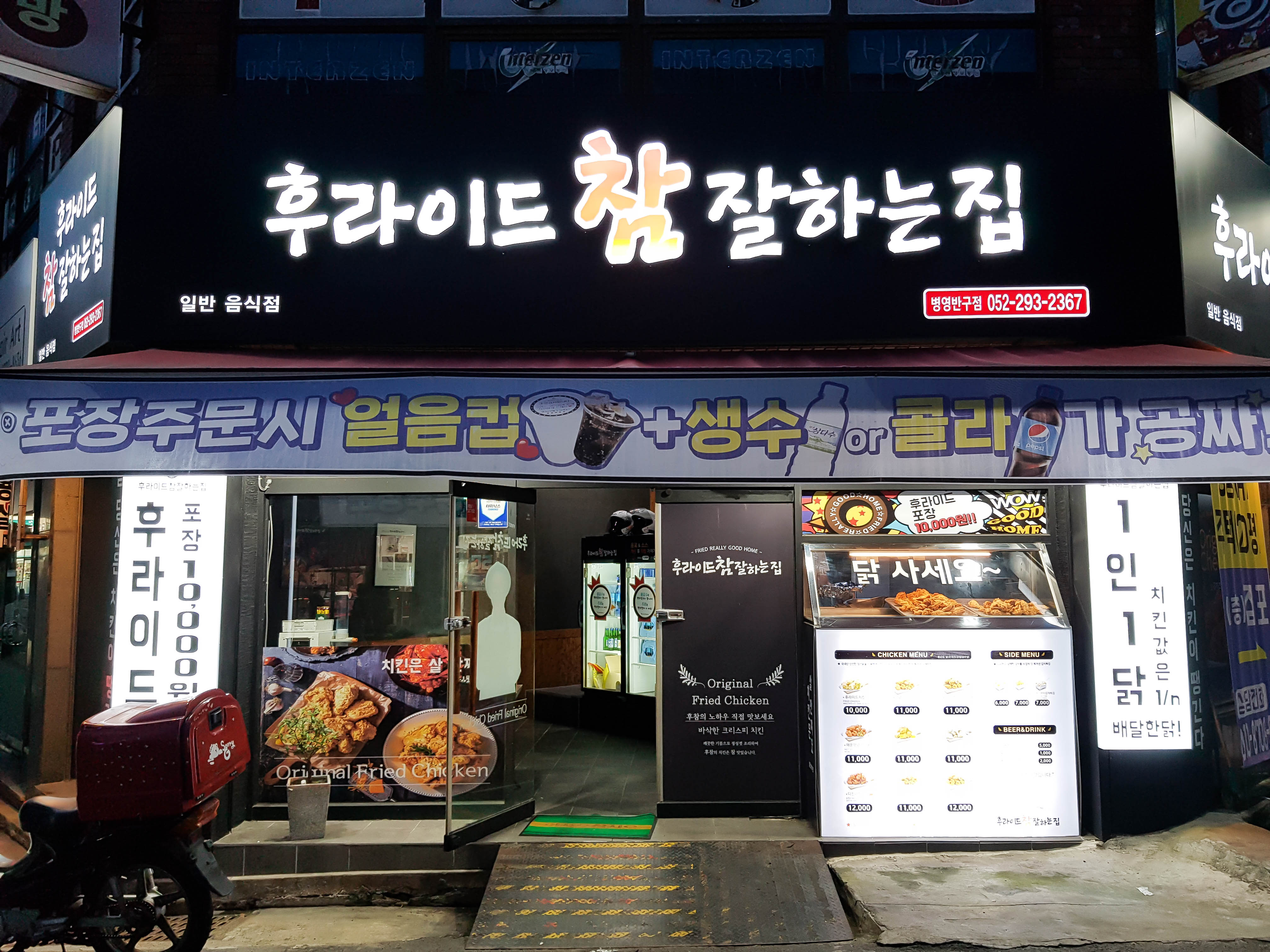 후라이드 참 잘하는 집이 생긴 지 얼마 안 된 브랜드라서 그런지 소소한 인테리어나 문구들이 감각적이었어요. 우측에는 초벌 되어 있는 후라이드가 잘 보이게 진열되어 있었습니다. 사실 저렇게 초벌로 진열해놓으면 주문이후 빨리 나온다는 장점이 있는 반면에 회전율이 좋지 못할 땐 시간이 지남에 따라 식감과 맛이 떨어지는 단점도 있어요. 그래서 개인적으론 초벌 해놓고 2차 튀김 하는 걸 별로 좋아하진 않는데요. 그래도 외부에서 봤을 때 내부가 깔끔해 보여서 그 부분은 좋았습니다.