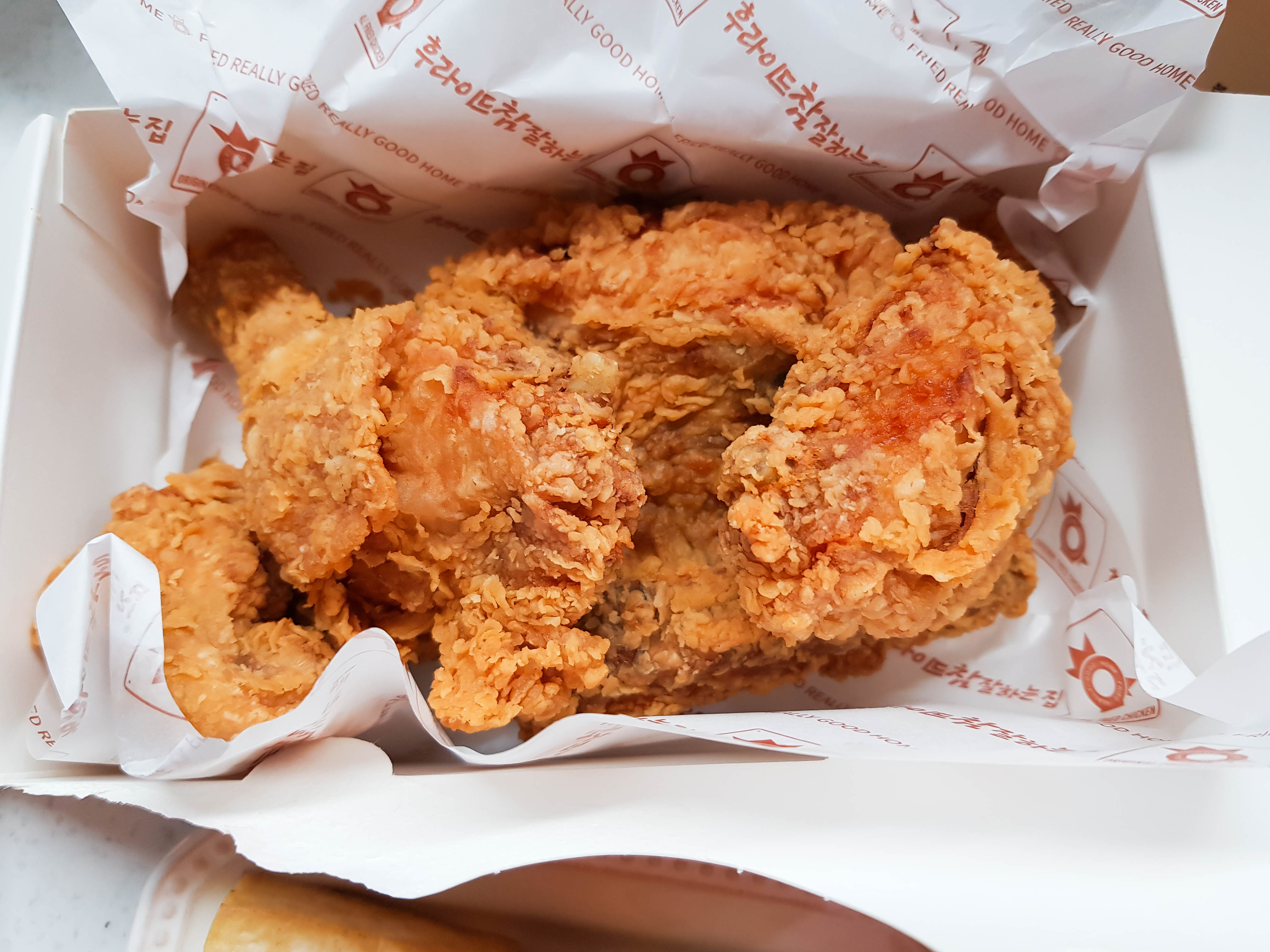 상자를 열었습니다. 상자를 열어보니 역시 생각했던 대로 치킨이 크고 많지는 않았어요. 보통 BBQ나 BHC, 네네치킨 같은 배달 치킨 전문점들이 치킨을 10호, 1kg짜리를 쓰고. 앞에서 언급했던 부어치킨, 썬더치킨 같은 포장 전문점들이 8호 , 9호 정도를 쓰거든요. 1호 차이가 보통 100g 정도 차이 나는 걸로 알고 있는데요. 100g이 뭐 얼마나 차이 나겠냐 싶어도 막상 후라이드 한 마리로 비교해보면 크기 차이가 좀 나는 편이에요. 여하튼 한 마리 반이지만 다른 배달 전문점 한 마리나, 한 마리+@ 정도 되는 양이었어요.