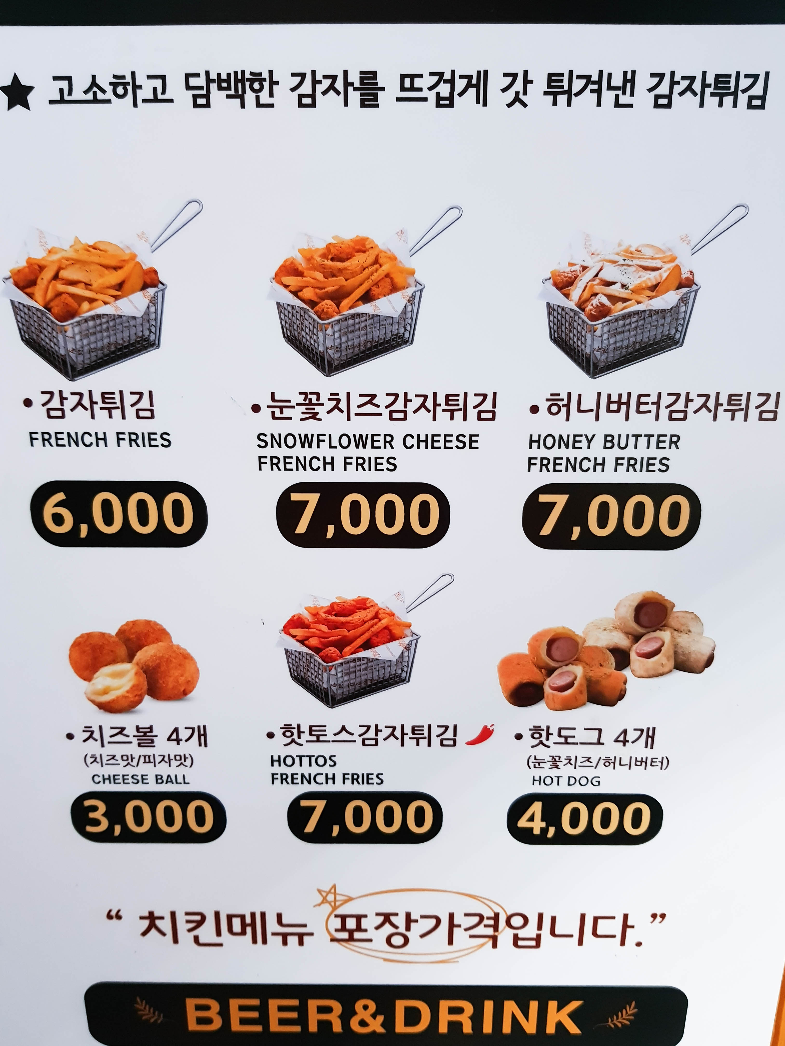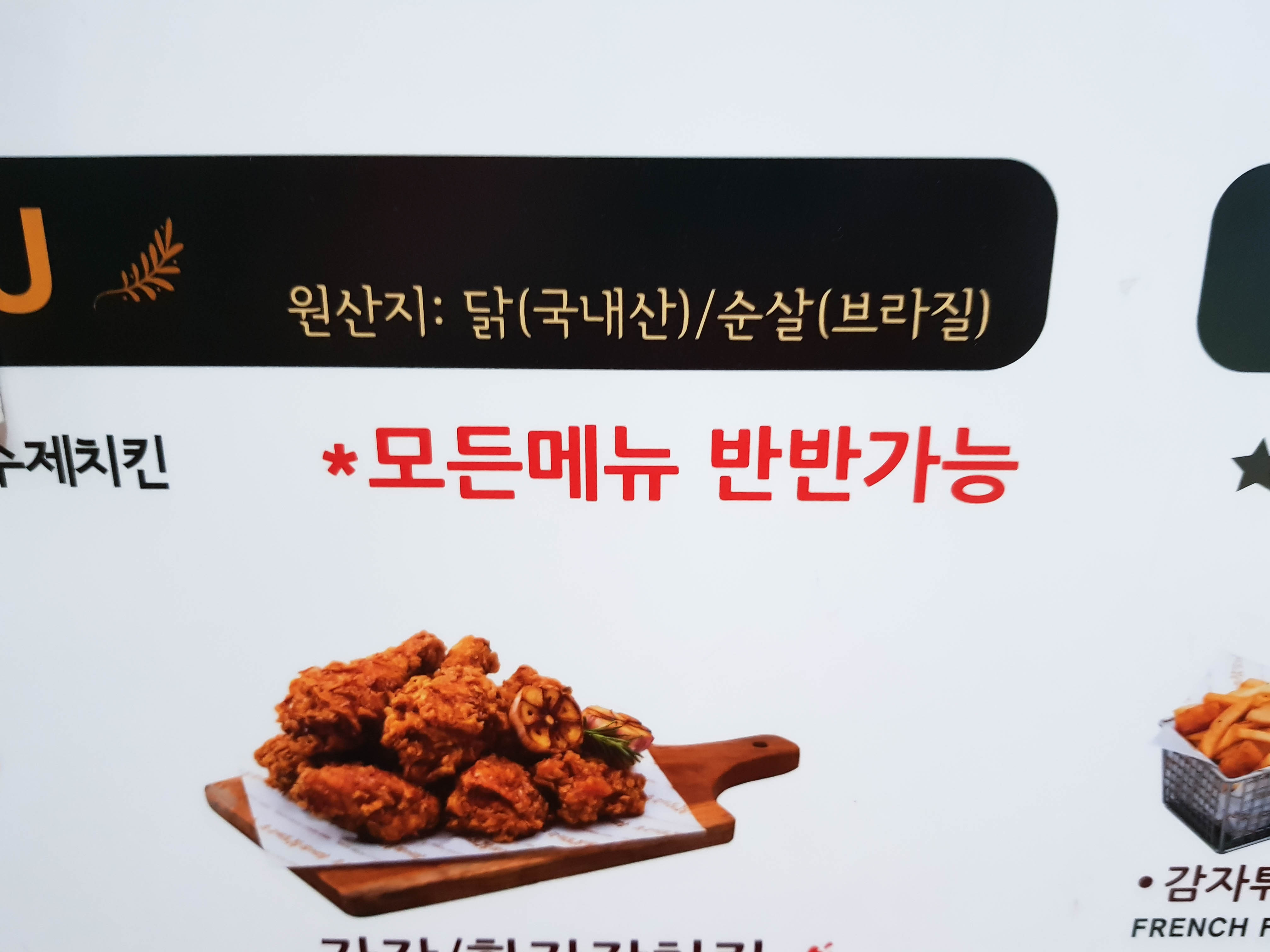 가게 내부에 있는 메뉴판 사진이에요. 포장용 가격이라 그런지 치킨 가격은 요즘 타 브랜드 치킨들에 비해서 많이 착해 보였어요. 가격을 보니 예전에 유행했던 부어치킨과 썬더치킨이 생각나더라구요. 물론 받아보진 않아서 아직까지 양을 정확히는 알 수 없었어요. 한 마리 닭은 국내산이고 순살은 브라질산 인 것도 눈에 띄었습니다. 물론 저는 수입산이 이라고 국산보다 품질이 나쁘다고는 생각하진 않아요ㅎㅎ. 사이드 메뉴는 감자튀김 세트가 6,000원에서 7,000원 정도로 다른 치킨집 사이드 메뉴에 비해서는 가격이 좀 비싼 느낌이었습니다.