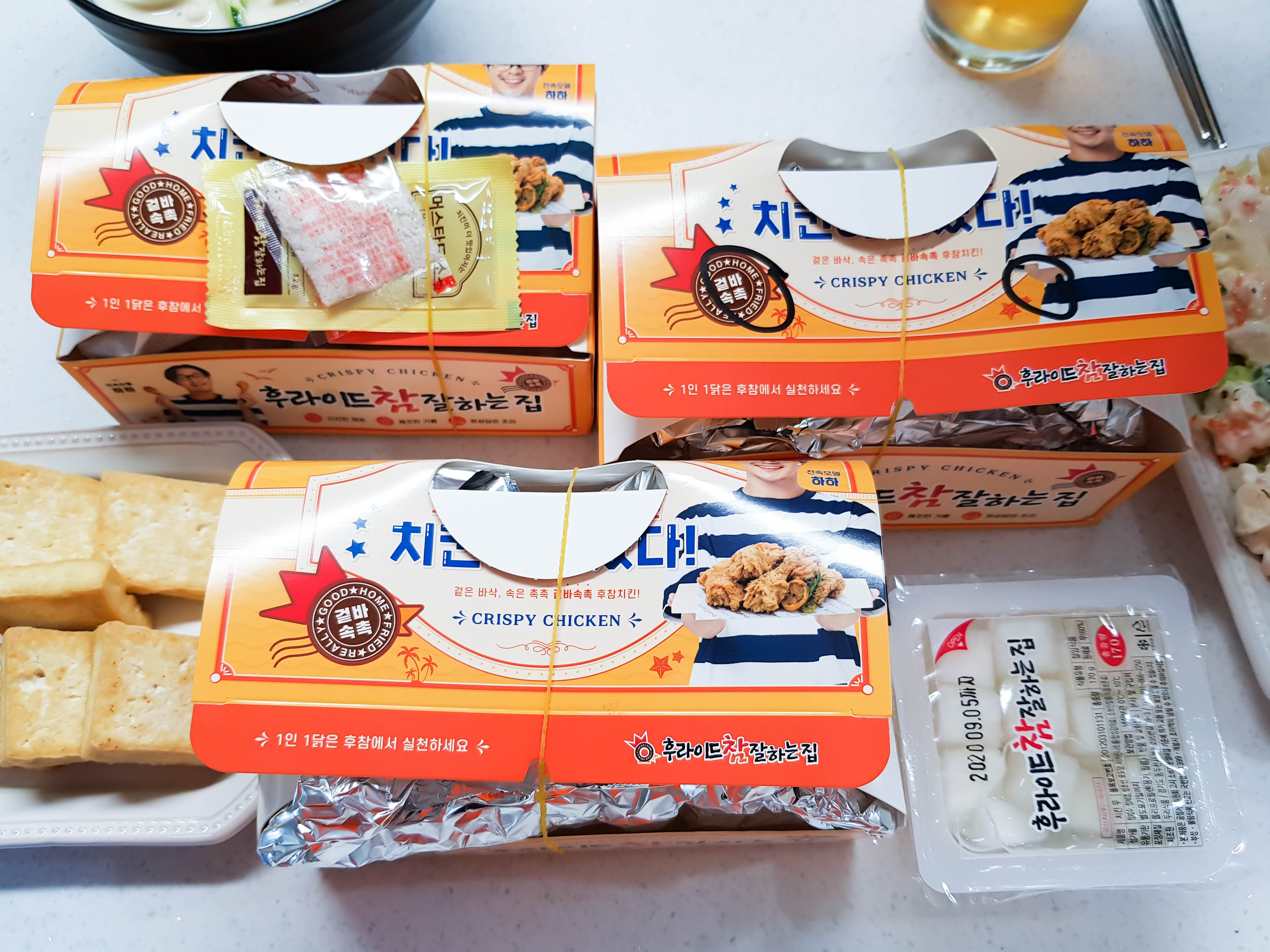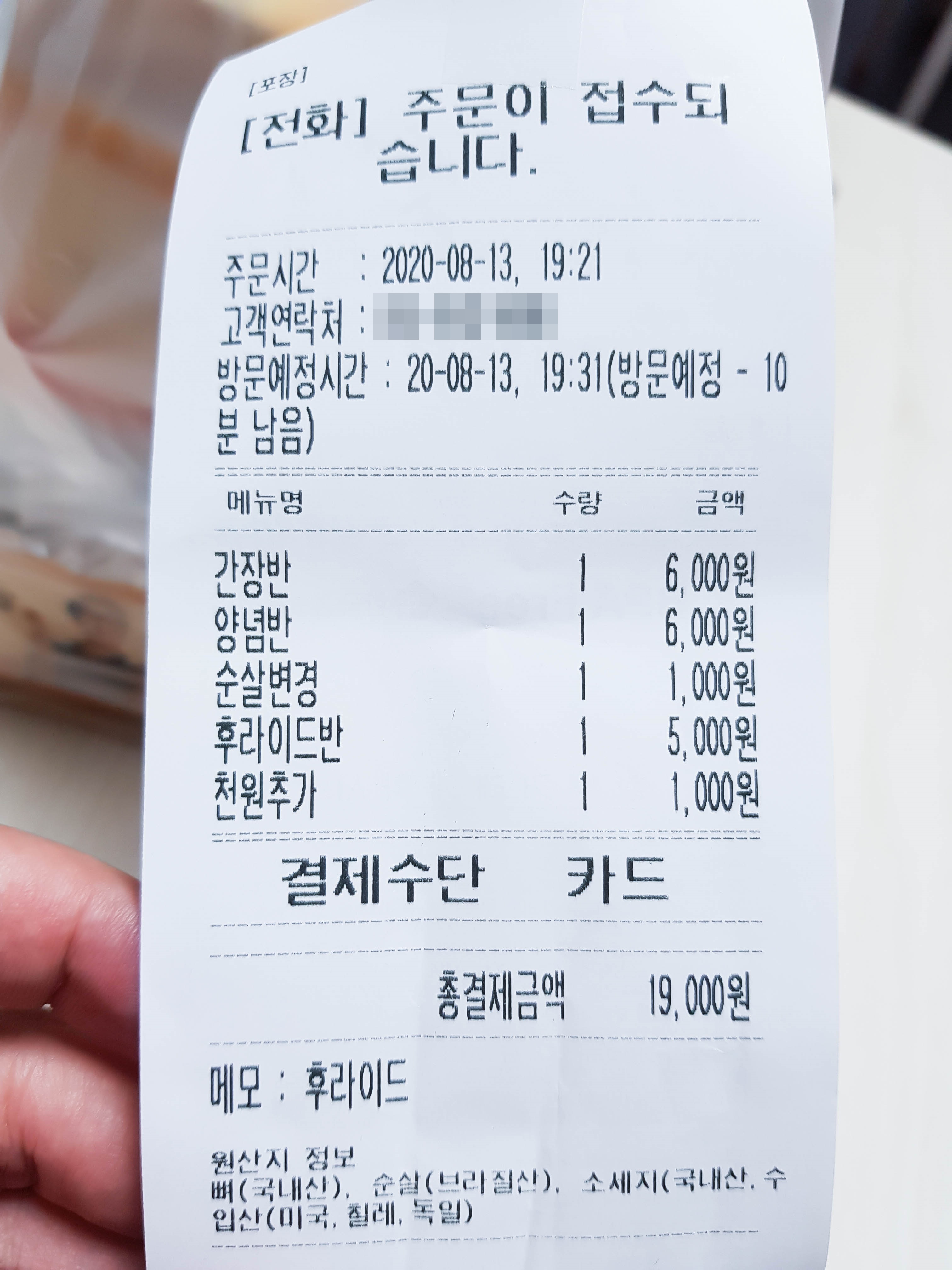 테이크 아웃해서 친구 부부네 집에 도착했습니다. 제 돈 주고 사 먹은 영수증이구요. 가격은 확실히 포장인걸 감안하더라도 많이 착한 느낌이었어요. 후라이드 반마리에 5,000원이라니.. 보통 배달 전문점 치킨 후라이드 반마리 주문하면 8,000원 9,000원 하니까요.(물론 구성에 조금씩 차이는 있습니다.)