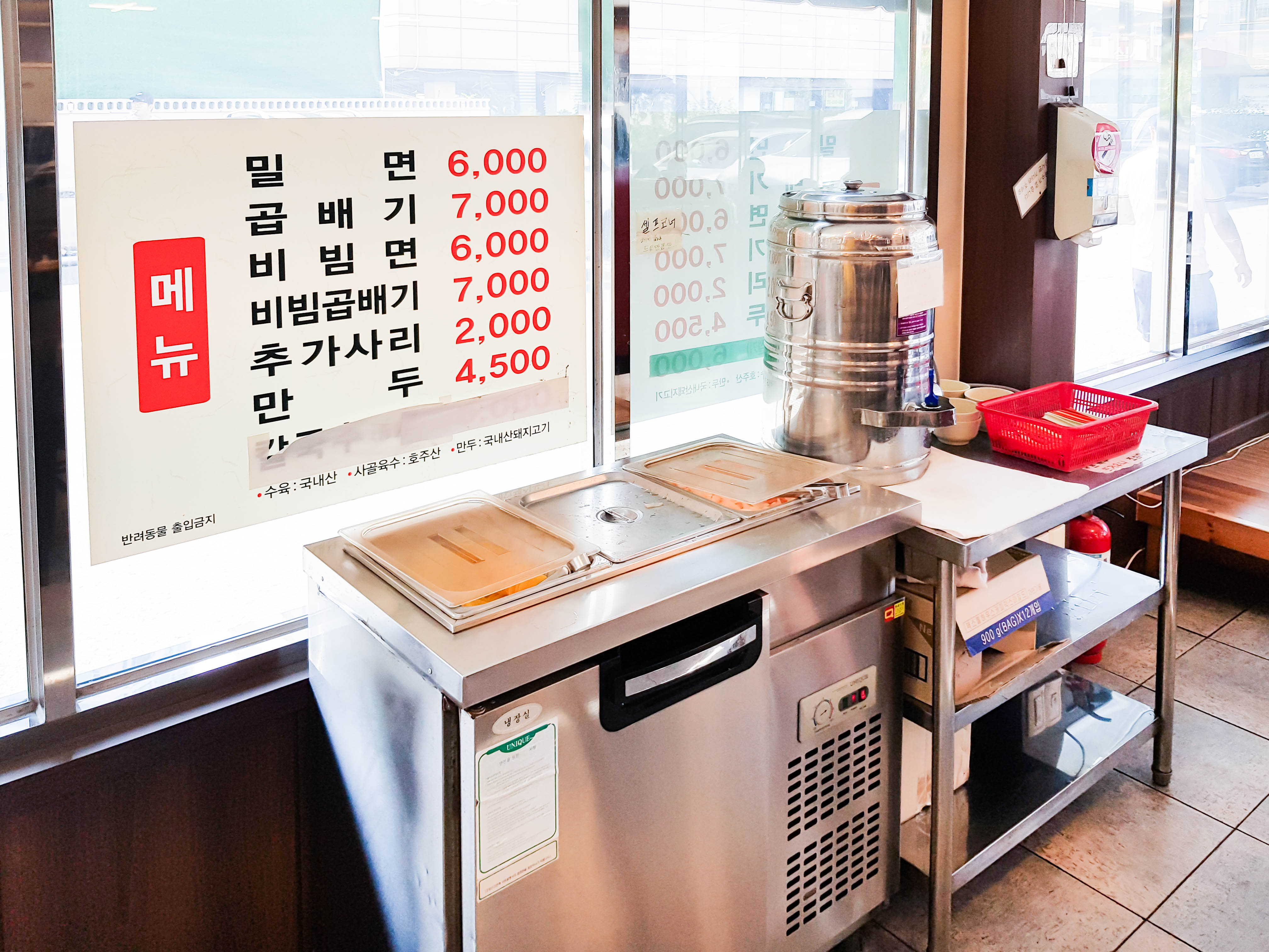 가격은 물밀면 6,000원 물밀면 곱빼기 7,000원 비빔밀면도 가격 동일. 만두 한판은 4,500원. 필자는 와이프와 가면 물밀면 보통 2개를 주문 하기도 하지만 물밀면 곱빼기 한 그릇과 만두 한판을 시키기도 함. 나눠 먹는 게 상관없는 사이라면 곱빼기와 만두 한판 조합도 추천함. 육수도 맛이 괜찮은데 셀프바에서 원하는 만큼 먹을 수 있는 것도 장점.