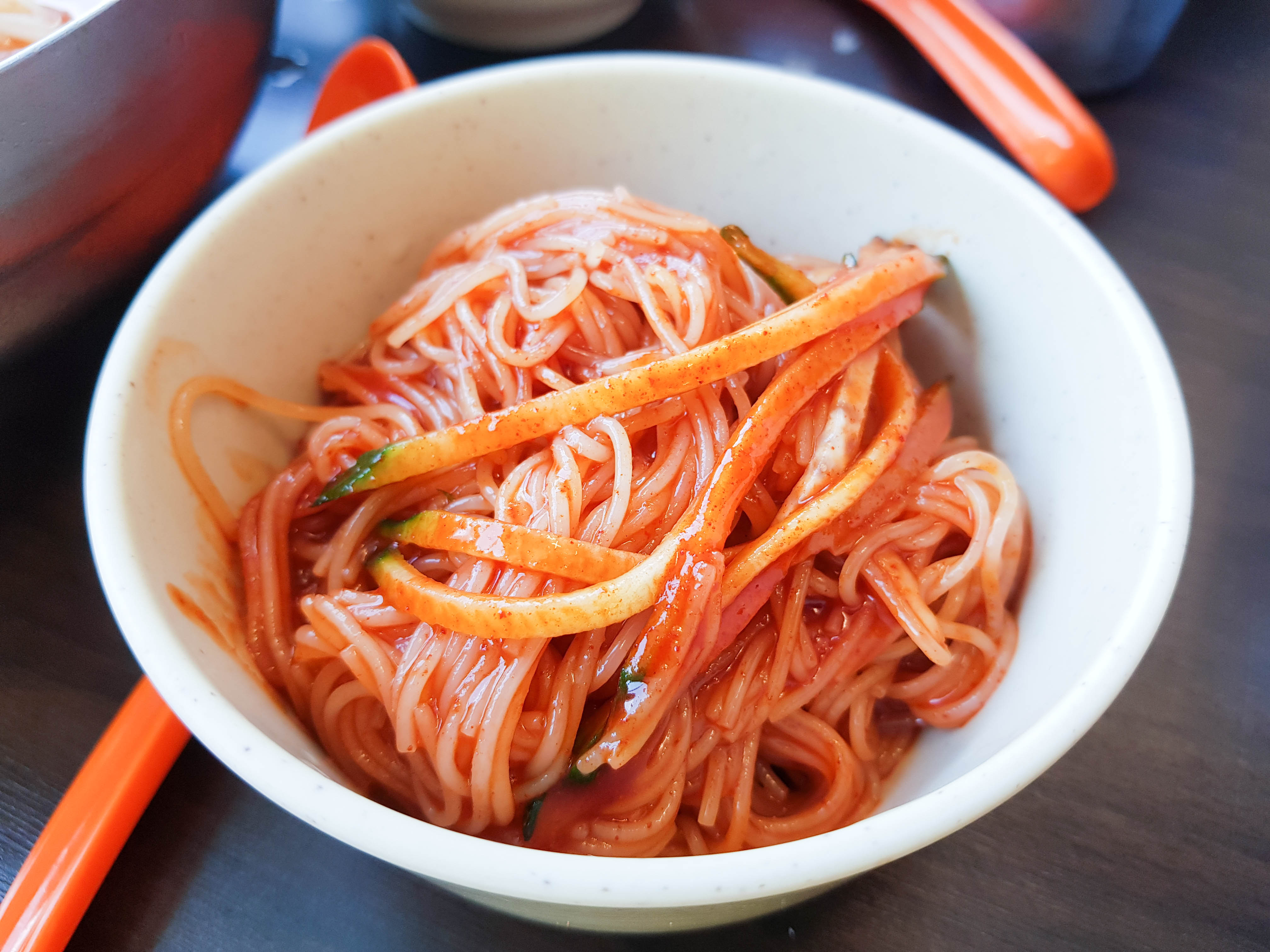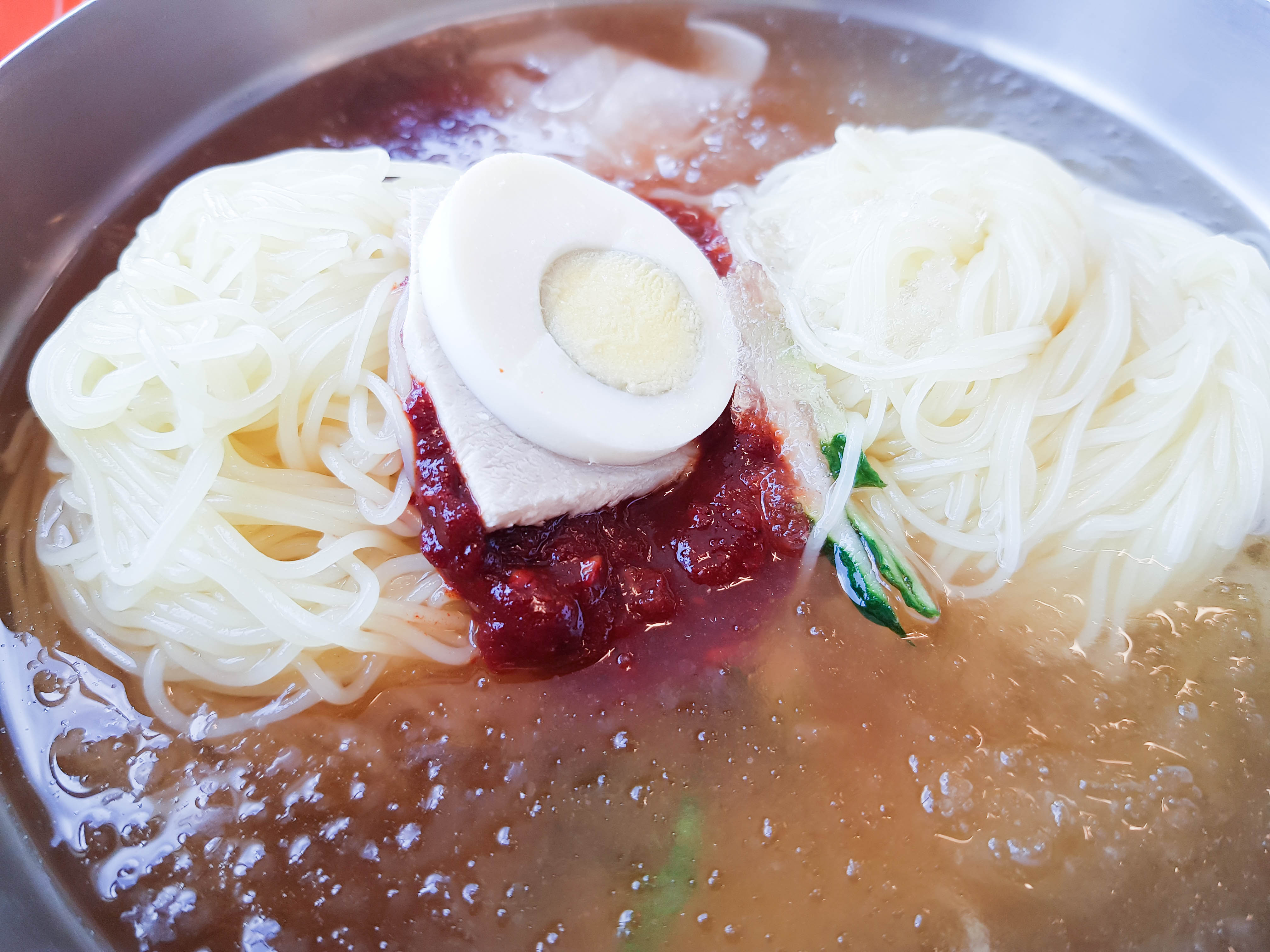 곧 밀면이 서빙됨. 아래에 면 두 덩이가 곱빼기임. 사진은 잘렸지만 물밀면 보통과 비빔밀면도 주문함. 개인적으로 물밀면은 양념을 반 정도 덜어내서 먹음. 양념은 취향껏 덜어서 드심을 추천. 맑은 육수도 기본적으로 간도 있고 맛도 있어서 빨간 양념을 굳이 다 안 넣어도 충분히 맛있음. 식초도 테이블에 있으니 취향껏 넣으면 맛있음.