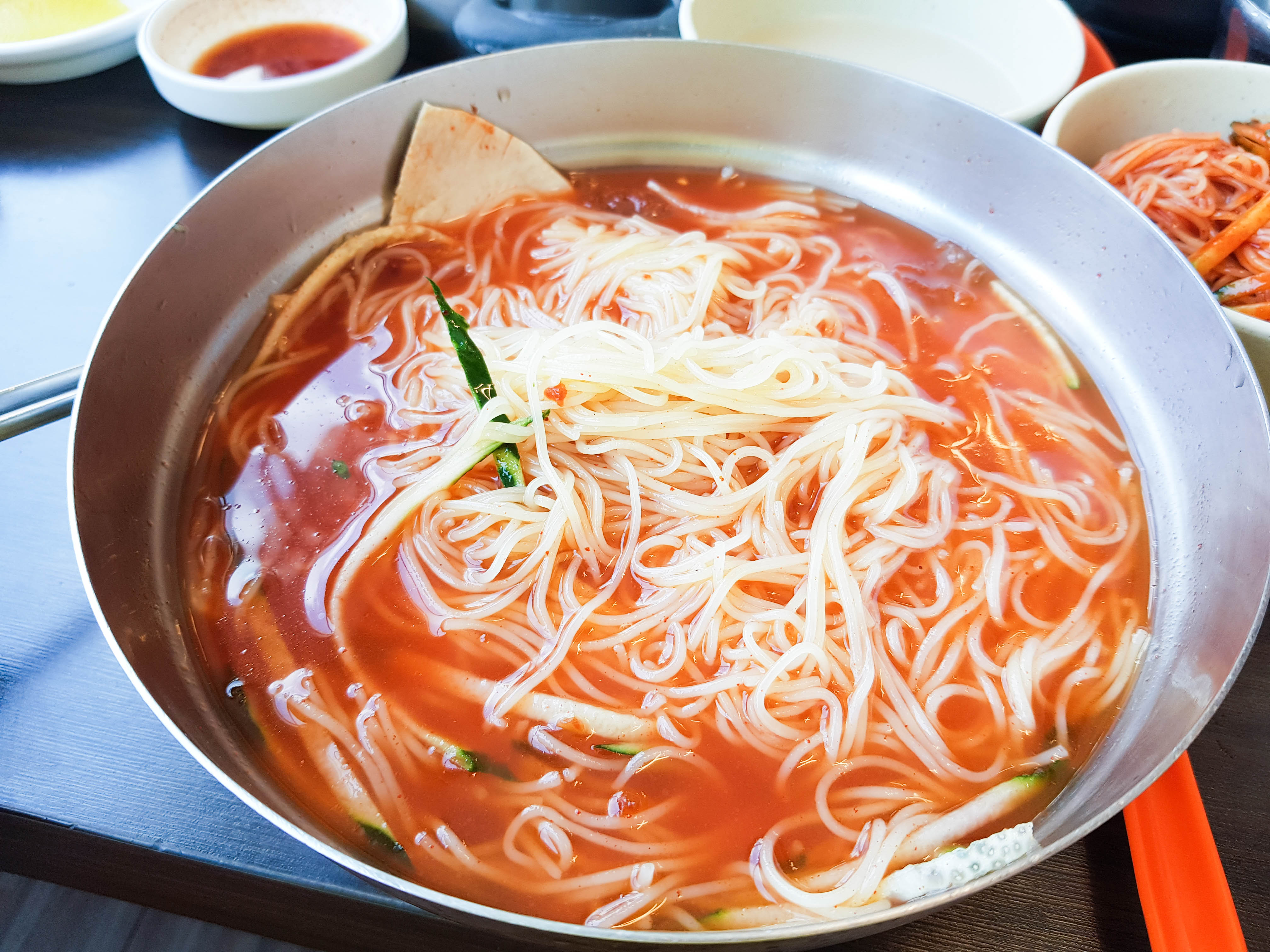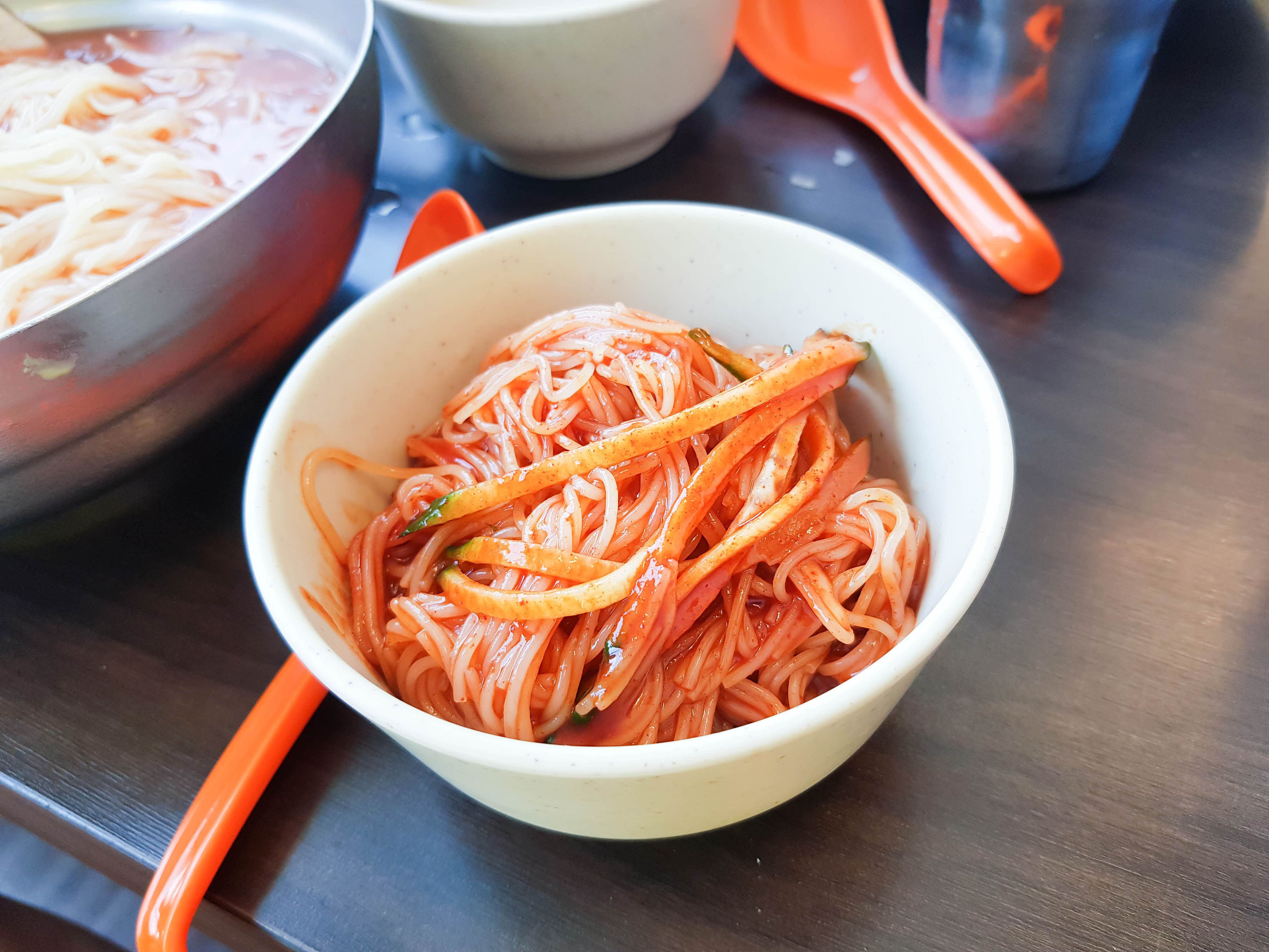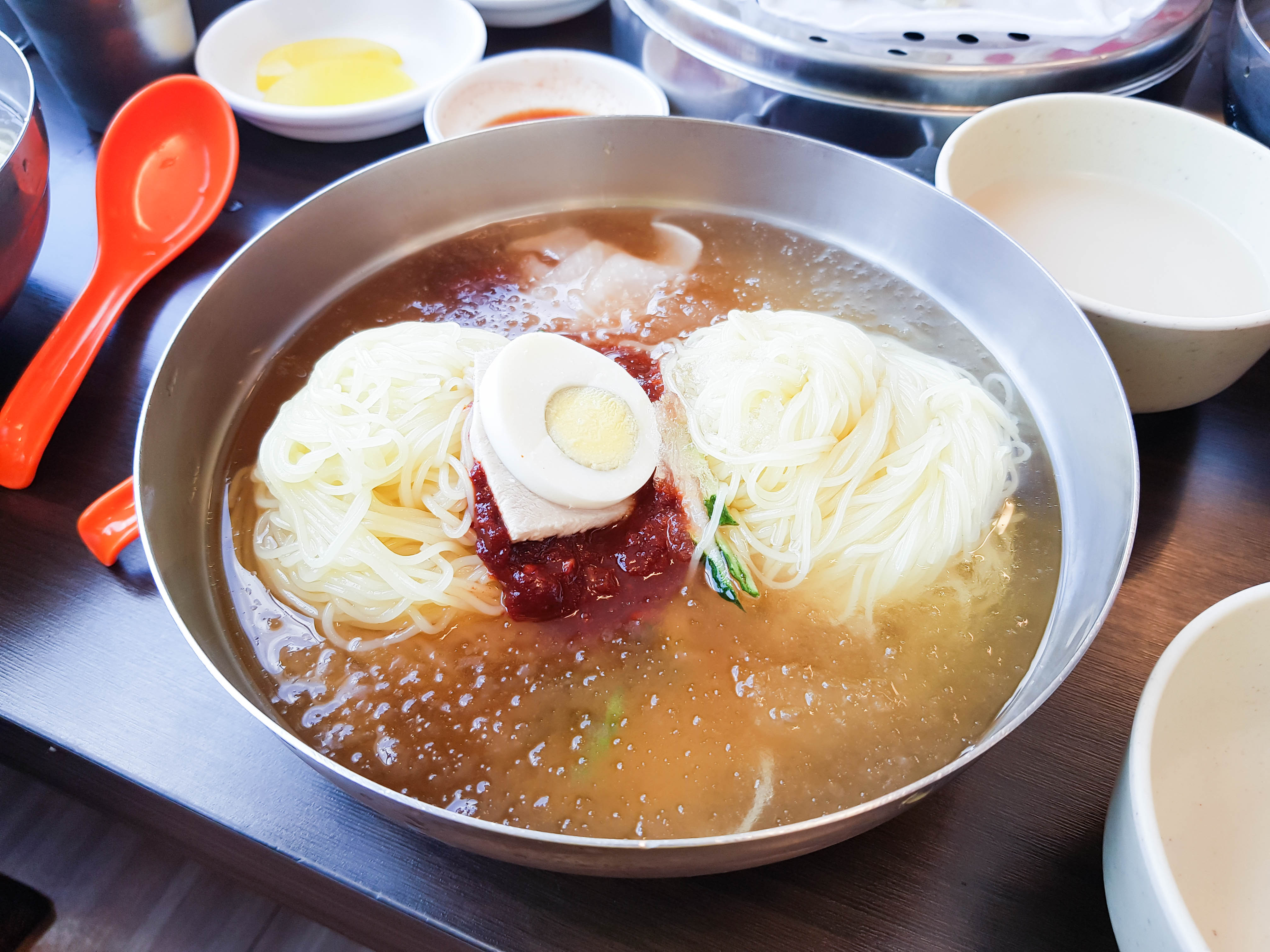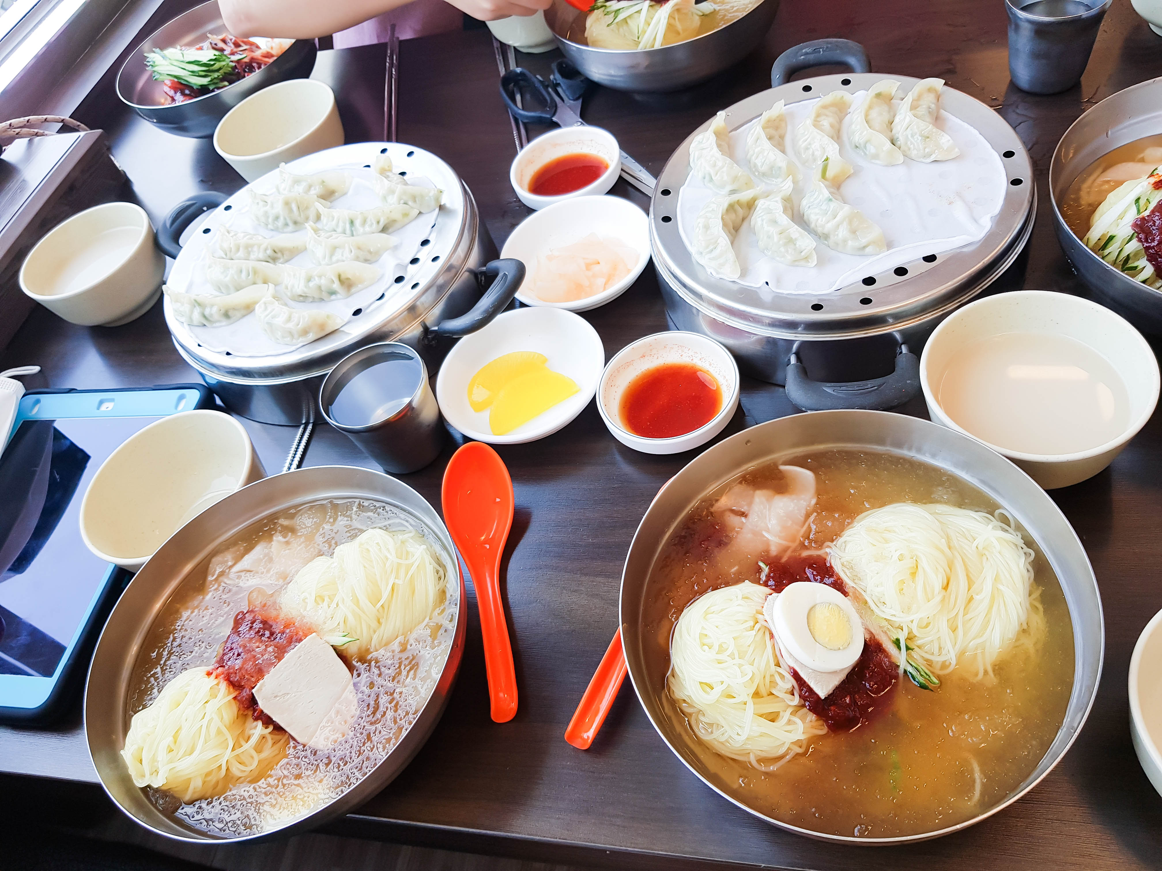곧 밀면이 서빙됨. 아래에 면 두 덩이가 곱빼기임. 사진은 잘렸지만 물밀면 보통과 비빔밀면도 주문함. 개인적으로 물밀면은 양념을 반 정도 덜어내서 먹음. 양념은 취향껏 덜어서 드심을 추천. 맑은 육수도 기본적으로 간도 있고 맛도 있어서 빨간 양념을 굳이 다 안 넣어도 충분히 맛있음. 식초도 테이블에 있으니 취향껏 넣으면 맛있음.
