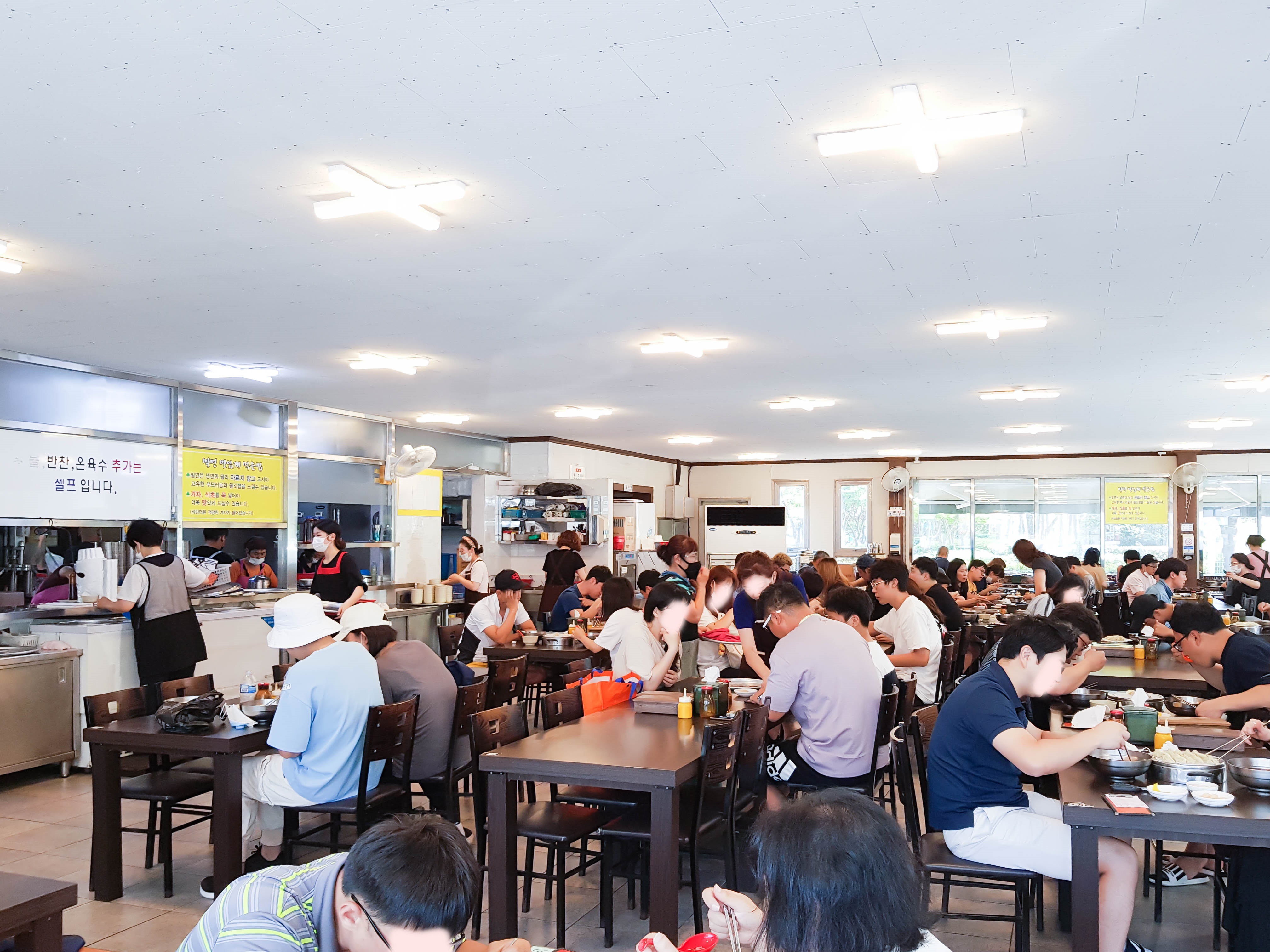 삼산동 밀면전문점은 넓은 주차장이 장점임. 주차장이 크지만 여름엔 손님이 많은 만큼 넓지만 주차가 쉽진 않음. 가게를 나가면 바로 맞은편에 공터도 밀면전문점 주차장으로 사용 중. 여름에 바쁠 땐 주차요원들이 다른 주차장까지도 안내를 해줌. 한창 더울 땐 점심시간엔 대기줄도 자주 보이지만 회전율이 높아서 대기가 많이 길진 않고 금방 자리로 안내받을 수 있음. 하지만 홀에 일하는 직원들도 너무 바빠서 적극적으로 내 자리를 찾지 않으면 종종 새치기도 당함. 적극적으로 내가 먼저다 어필을 하며 자리를 찾아서 앉아야 함.